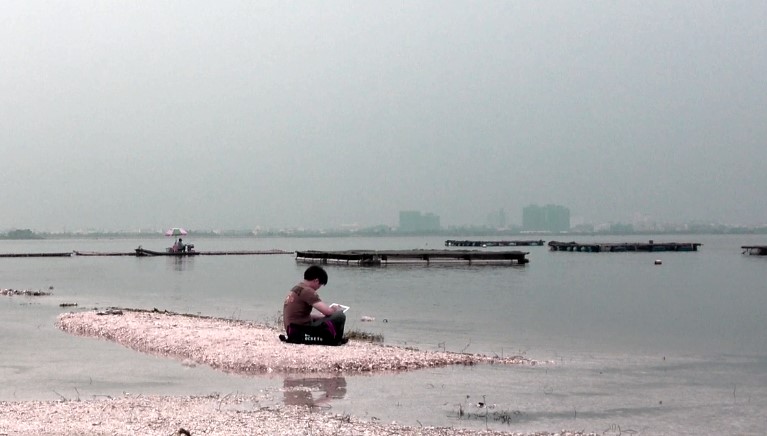 下大鵬灣。後來我看漁夫船停在蚵島周邊,然後開始將